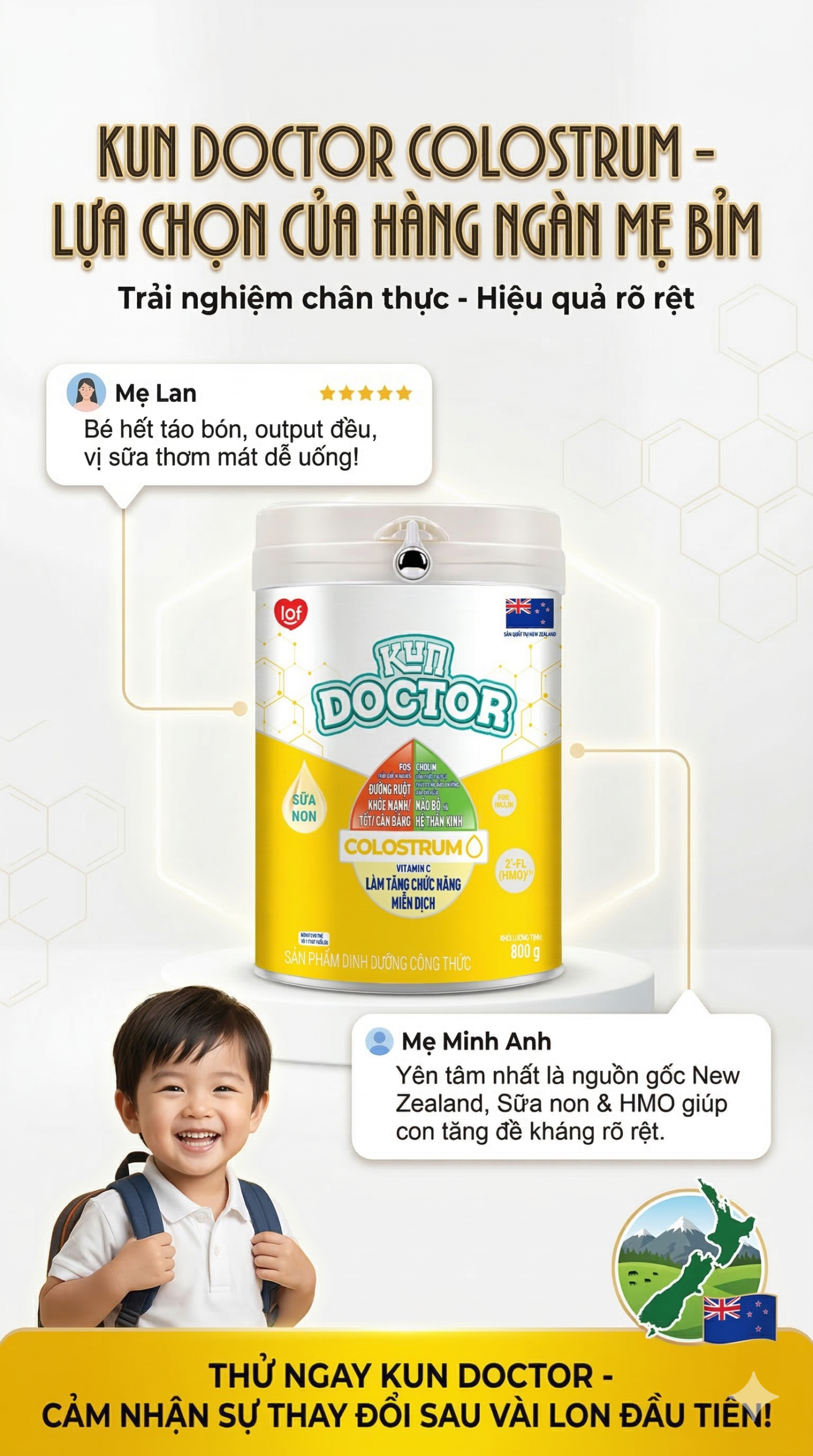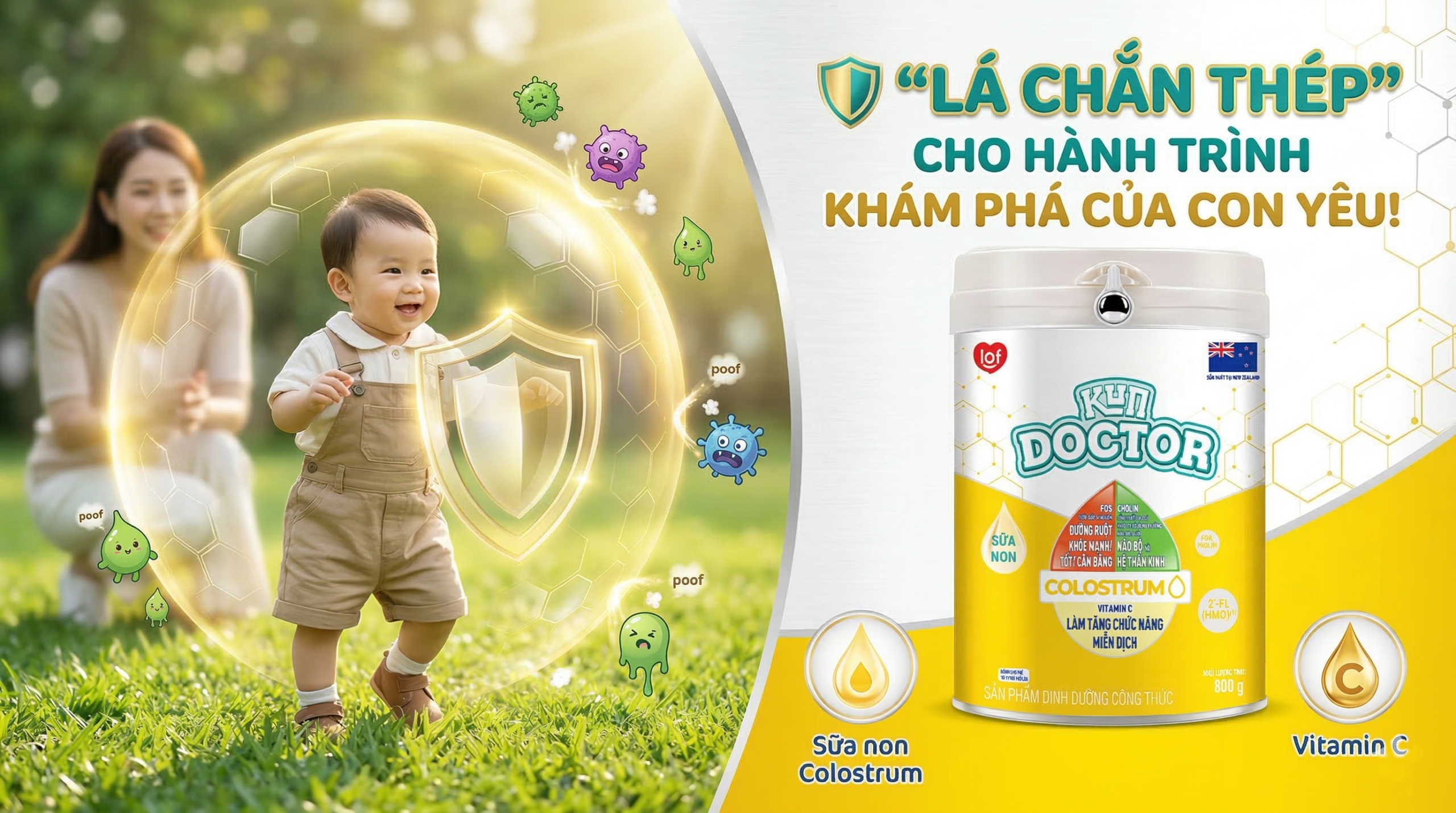 Kun Doctor Colostrum nhân đôi bảo vệ với hàm lượng Sữa non 24H 1100mg/l giàu kháng thể IgG kết hợp cùng 2’-FL (HMO) là prebiotic có trong sữa mẹ có chức năng hỗ trợ miễn dịch giúp trẻ khỏe mạnh, hỗ trợ hệ tiêu hóa, ngăn ngừa táo bón.